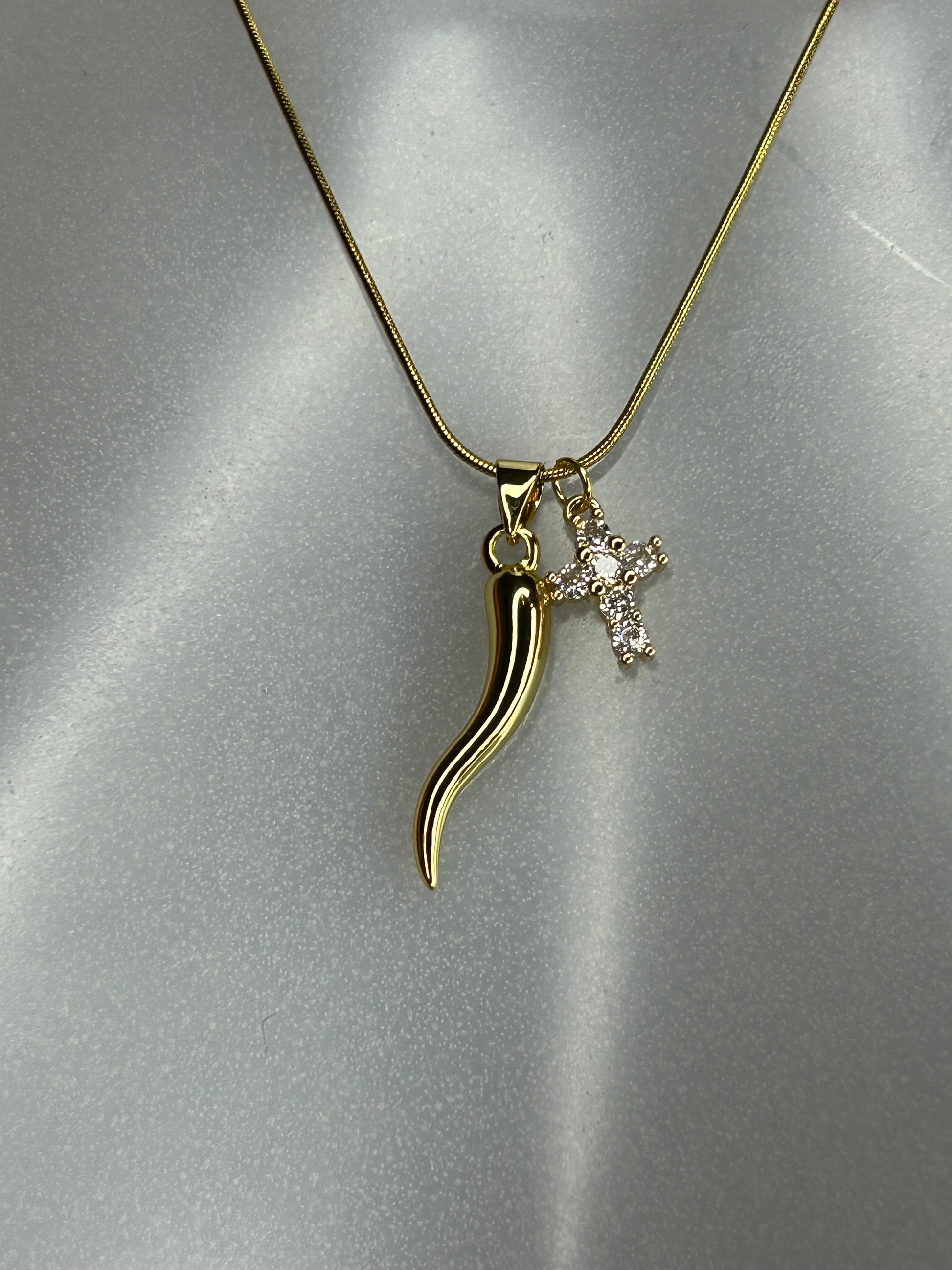 Halskette „Blessing “, 14KT gold plated mit Strass-Kreuz und Glücks-Horn